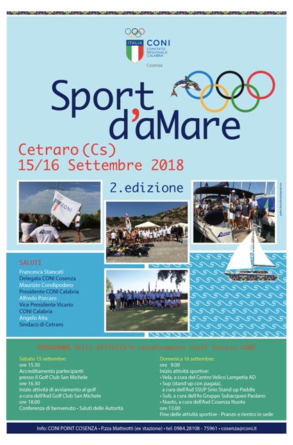 Dopo i buoni risultati della prima edizione, il CONI Point di Cosenza guidato dall’avv. Francesca Stancati ripropone il progetto “Sport d’aMare”, a Cetraro (Cs) il 15 e 16 settembre.
